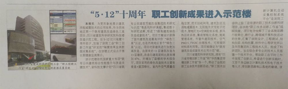 四川工人日報5月10日刊登文章《“5·12”十周年 職工創(chuàng)新成果進入示范樓》: